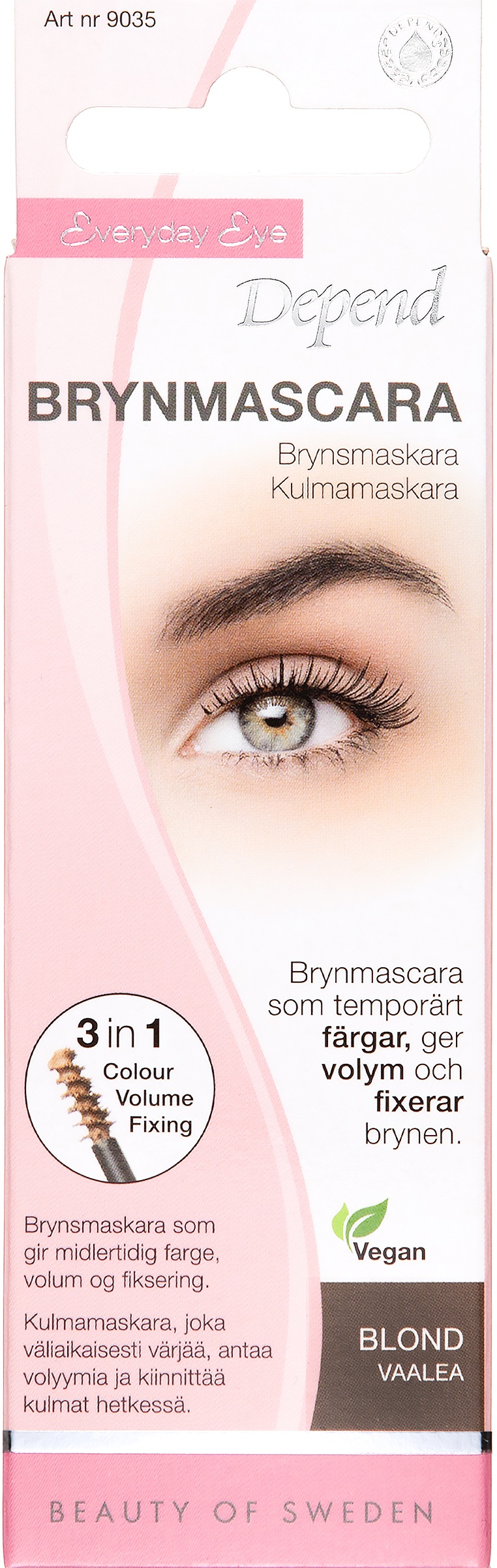 Kulmamaskara, joka väliaikaisesti värjää, antaa volyymia ja kiinnittää kulmat. Levitetään maskaraharjalla myötäkarvaan, jos halutaan täyteläiset ja hyvin muotoillut kulmat. Saatavana värit grafiitinharmaa, tummanruskea, keskiruskea ja vaalea. Long-lasting! Vegaaninen.