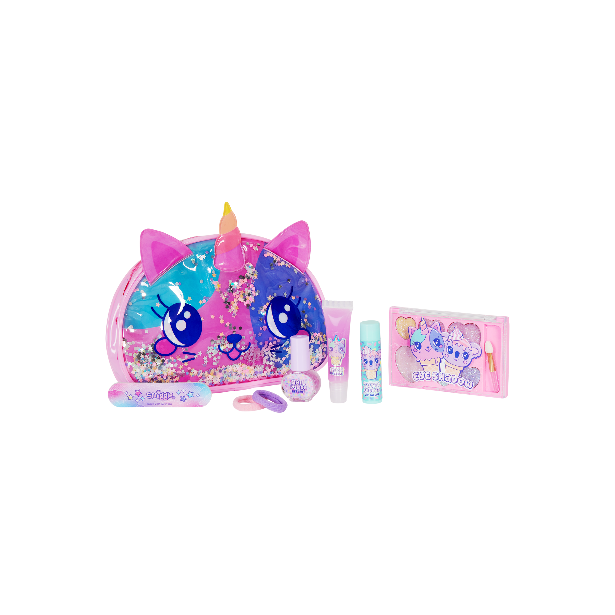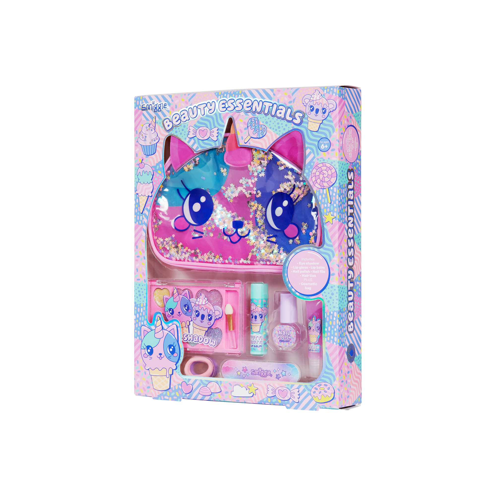 Suloinen lahjapakkaus lapsille, joka sisältää luomiväripaletin, huulikiillon, huulivoiteen, peel off kynsilakan, kynsiviilan, kaksi ponnaria sekä kosmetiikkapussin.